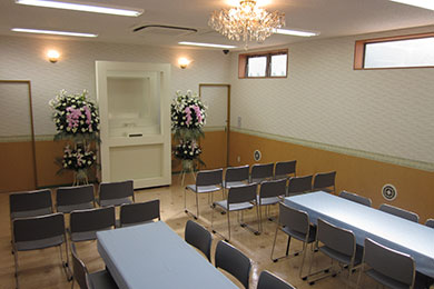 数名から最大10名まで対応の家族葬専用式場です。式場と控室が一体となっており、ご自宅にいるかのようにとても明るく、温かみのある雰囲気の式場です。シャワールームも完備しております。